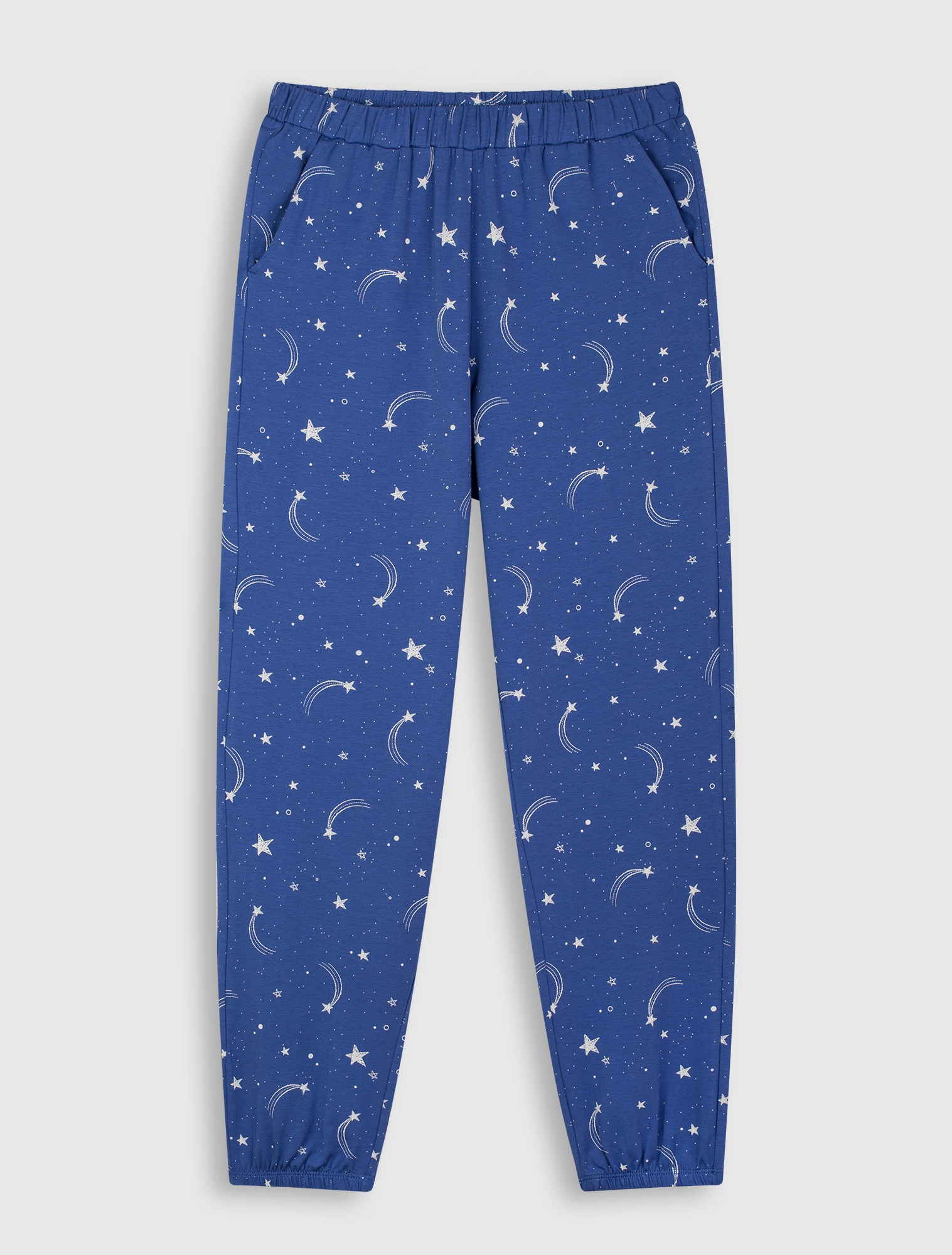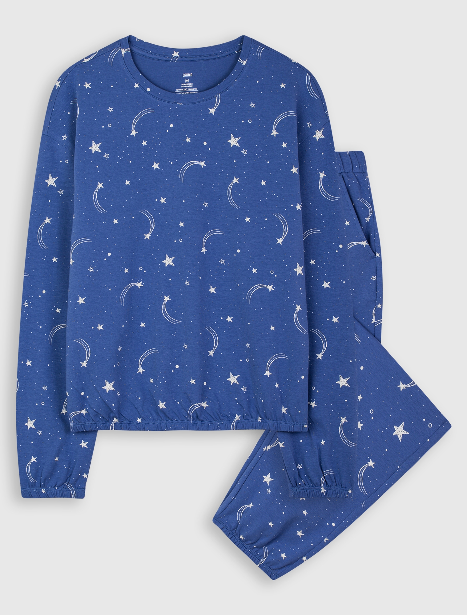 Áo cổ tròn bo tay, gấu áo có dây rút, quần dài cạp chun bo gấu