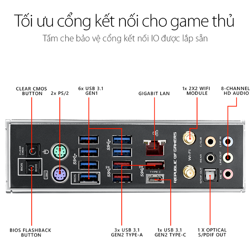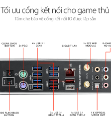 | Cổng giao tiếp ngoài | 2 x PS/2, 3 x USB 3.1 Gen 2 (red), 1 x USB 3.1 Gen 2 (black)Type-C, 6 x USB 3.1 Gen 1 (blue), 1 x Optical S/PDIF out, 1 x Clear CMOS button(s), 1 x USB BIOS Flashback® Button(s), 1 x ASUS Wi-Fi GO! module (Wi-Fi 802.11 a/b/g/n/ac and Bluetooth v5.0. |