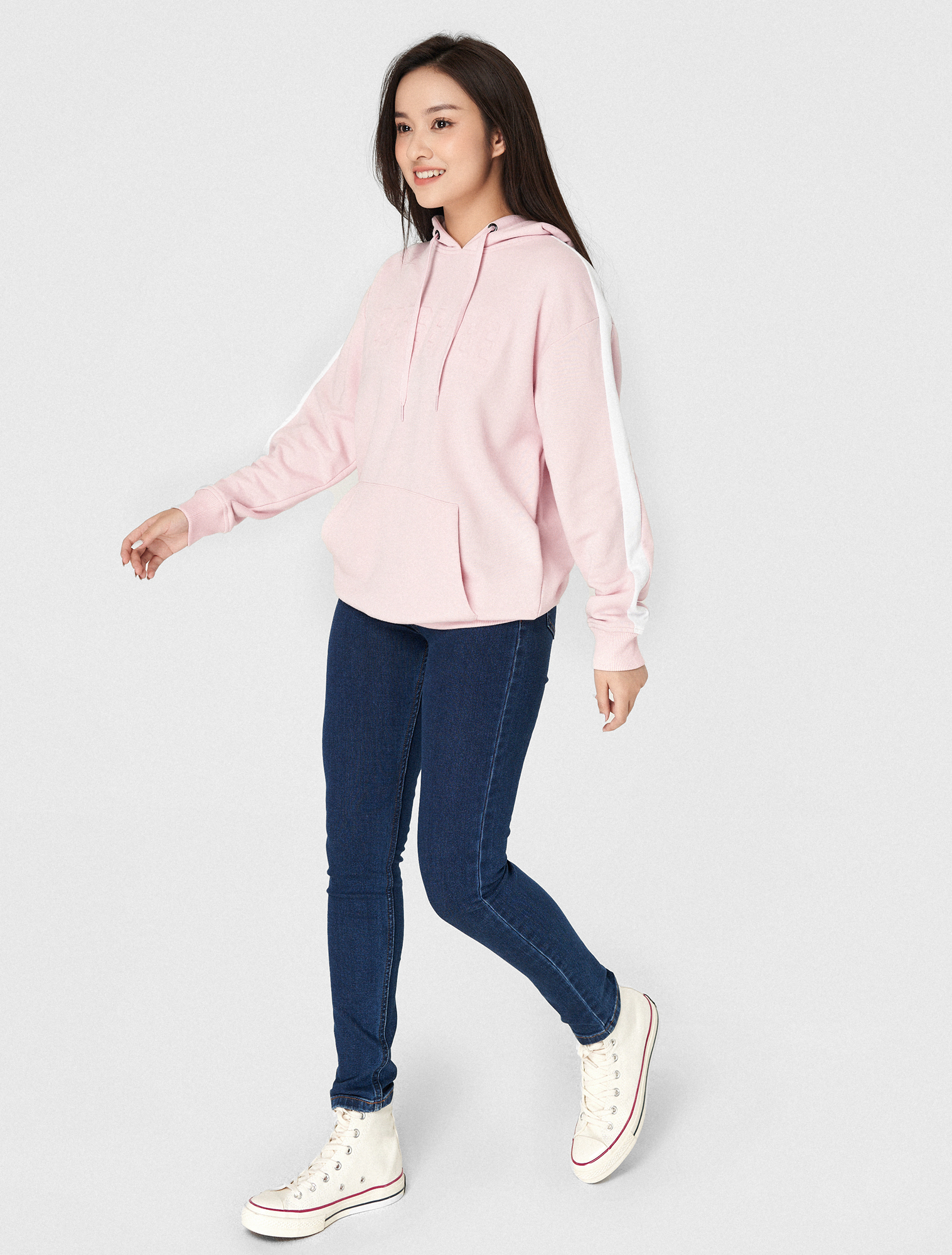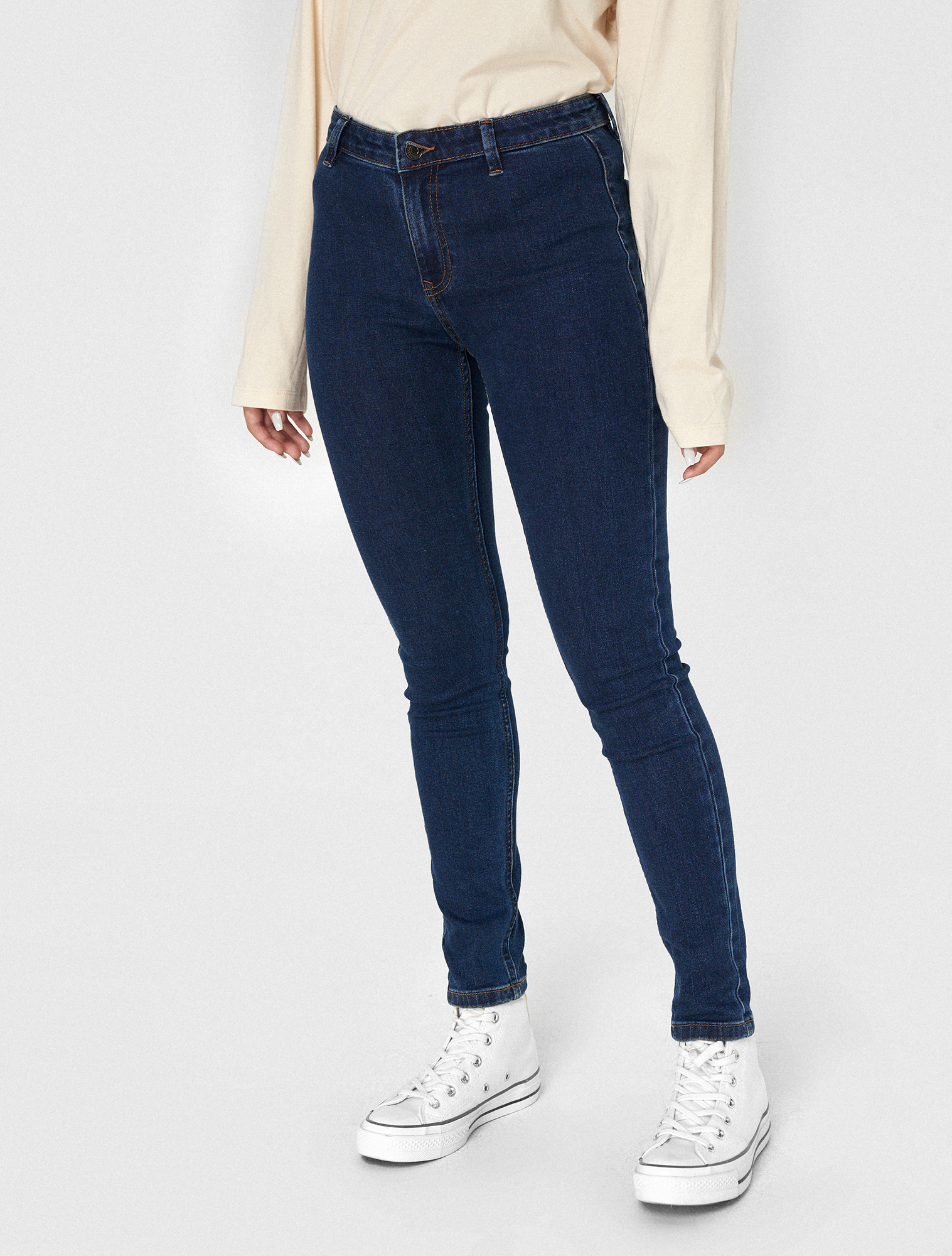 Dáng slim fit, cạp thường, cúc cài và khoá kim loại