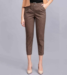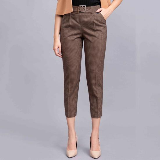 Quần tây nữ be nâu kẻ nhỏ Toson gấu xẻ V cạp trang trí 23028K620