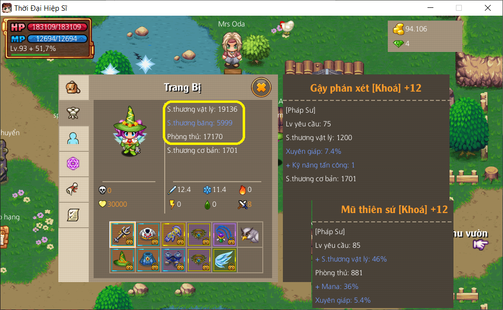 NỔI BẬT: VK +12 ĐỒ +12 , CÁNH +6 4,2% NỘ - CAO +14 TL – MAX , CÚ MAX LV29 CS 80 TL , MỀ +4 2D STVL DÒNG THỦ , 204 HS , 14 VÉ GIỜ VÀNG , 17 BVL , 1608 TT , 89 TG , MAX HÀNH TRANG , 3 ĐỤC LV2 + 2 ĐỤC LV3 , TÓC 100 NGỌC