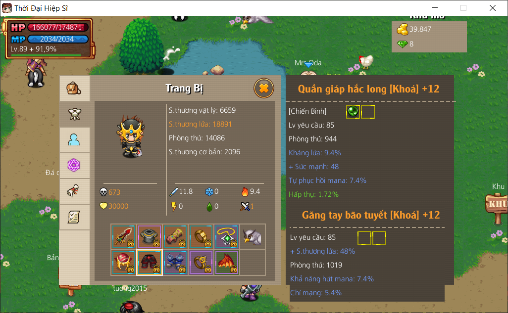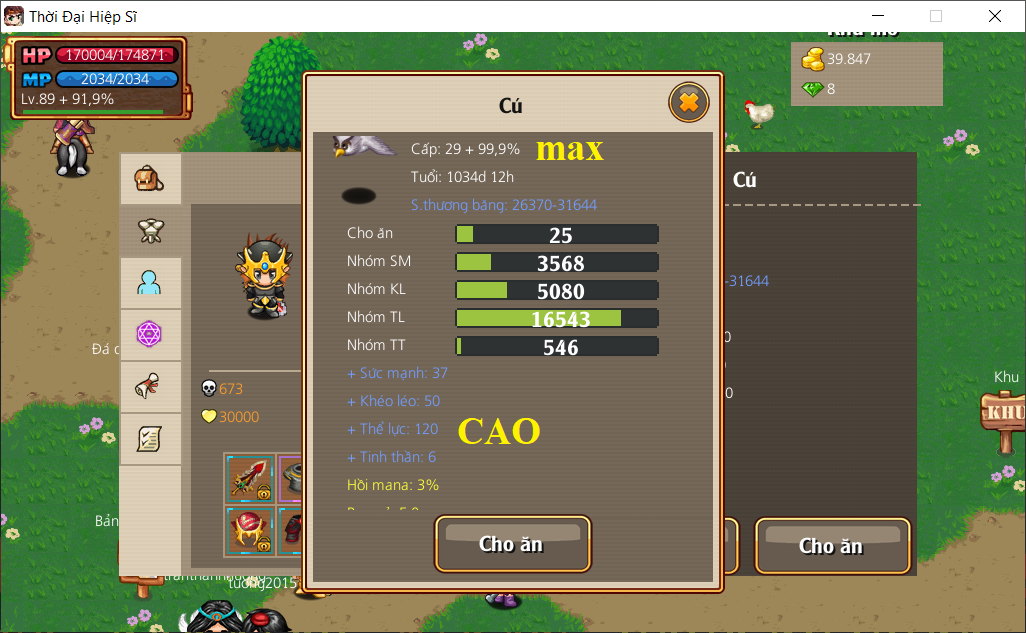 NỔI BẬT: VK +12 ĐỒ +12, CÁNH +8 3,6% NỘ, CÚ MAX LV29 CS 120 TL – CAO, MĐ +1, 20Đ TẶNG NGỌC, 493 HS, 38 BVL, NHIỀU KẸO PET & NL MĐ, 17 LỬA, 24 BÌNH DẦU, MAX HÀNH TRANG, 1844 KLVT, 13 ĐỤC LV1 + 6 ĐỤC LV2 + 3 ĐỤC LV3, 1 TÓC 100N + 1 TÓC 50N