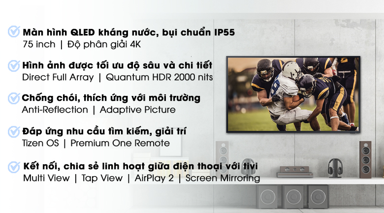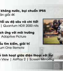 - Công nghệ hình ảnh:Công nghệ đèn nền Direct Full Array 120 blocksAuto Motion PlusQuantum HDR 2000 nitsBộ xử lý Quantum 4K với Trí Tuệ Nhân Tạo AIUltimate UHD DimmingFilm modeCông nghệ Quantum Dot hiển thị 100% dải màuHDR 10+Nâng cấp độ tương phản - Contrast Enhancer
