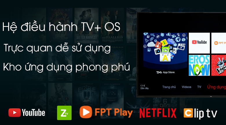 - Các ứng dụng sẵn có:YouTube, Netflix, Trình duyệt web, kho ứng dụng