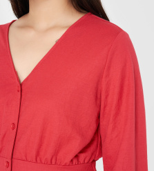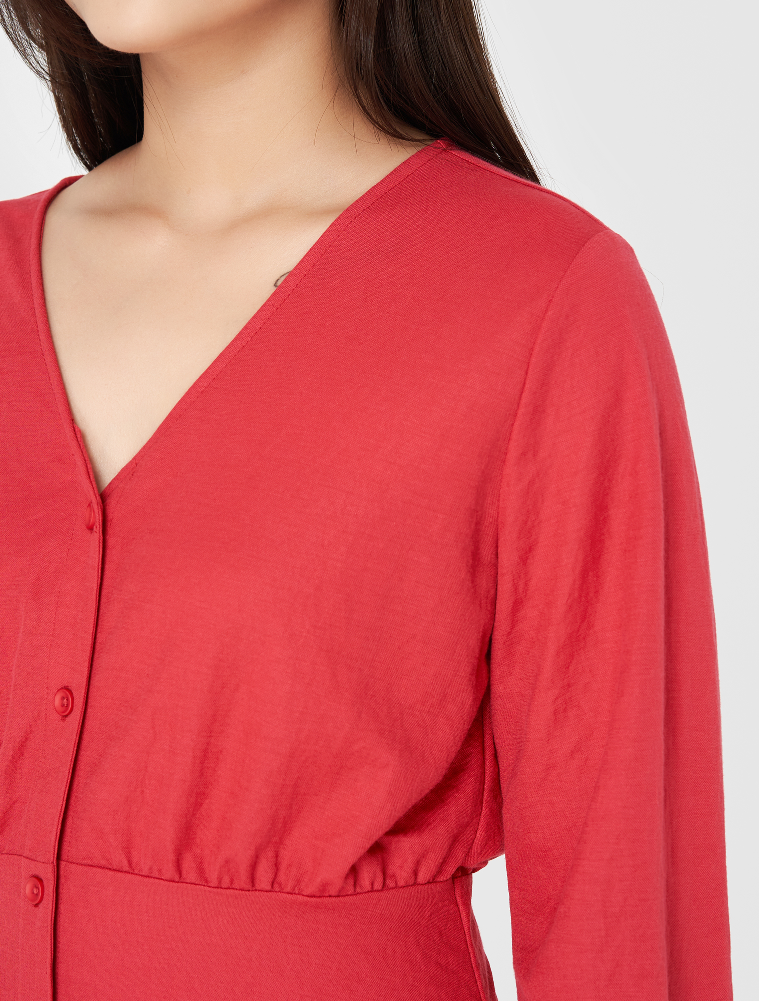 Cổ chữ V, tay bồng, khuy cài phía trước